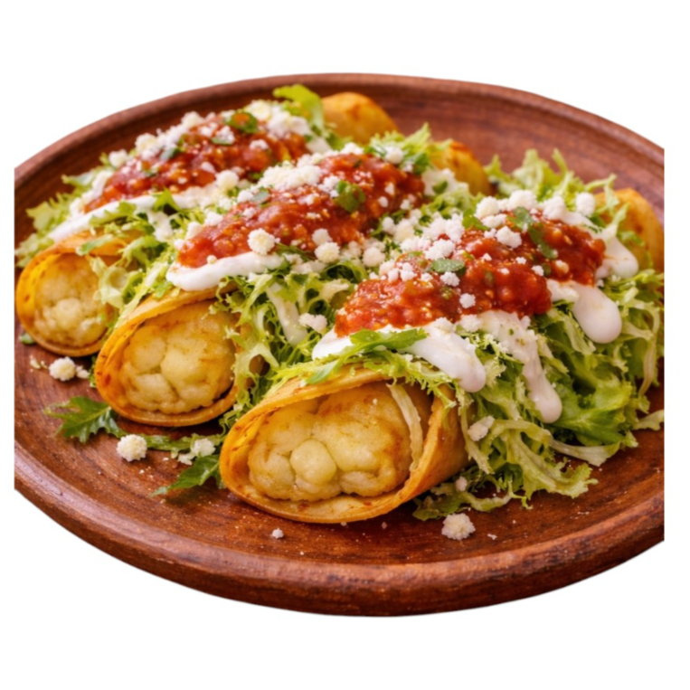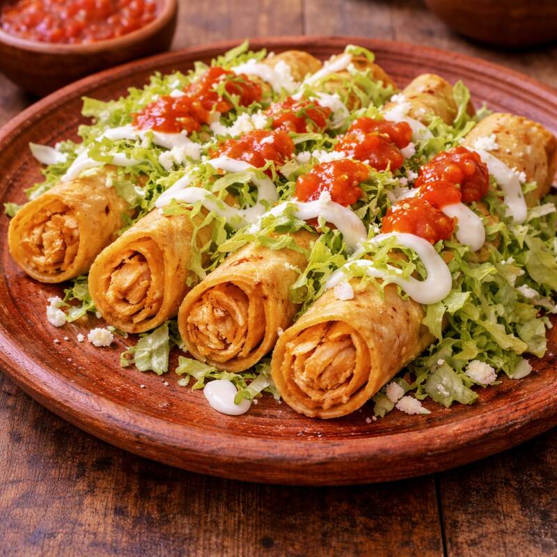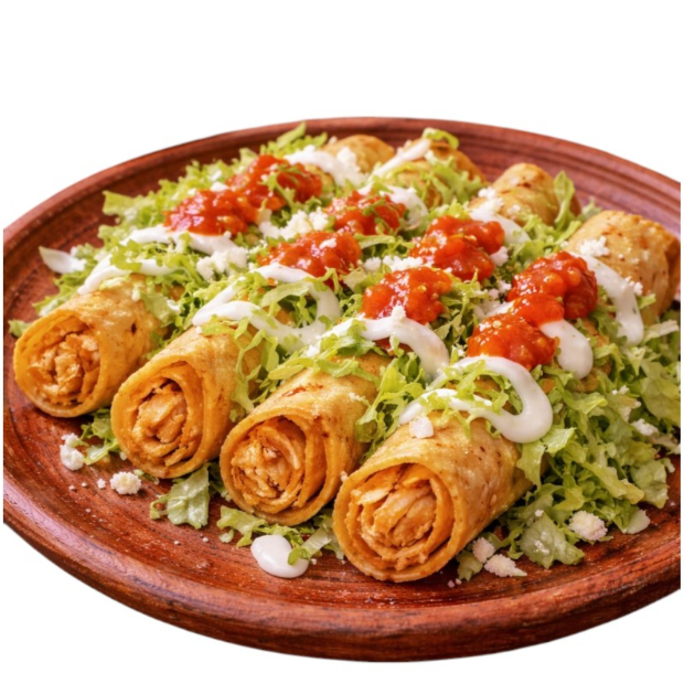 4 tacos dorados de pollo con una cama de lechuga, queso, crema y salsa