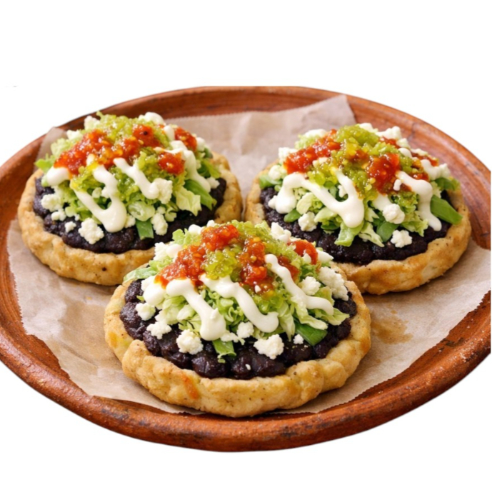 Masa frita de maiz, con una cama de frijoles, queso, crema, lechuga y salsa.