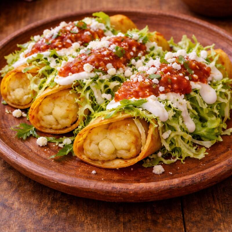 4 tacos dorados rellenos de papa. Encima una cama de lechuga, queso, crema y salsa