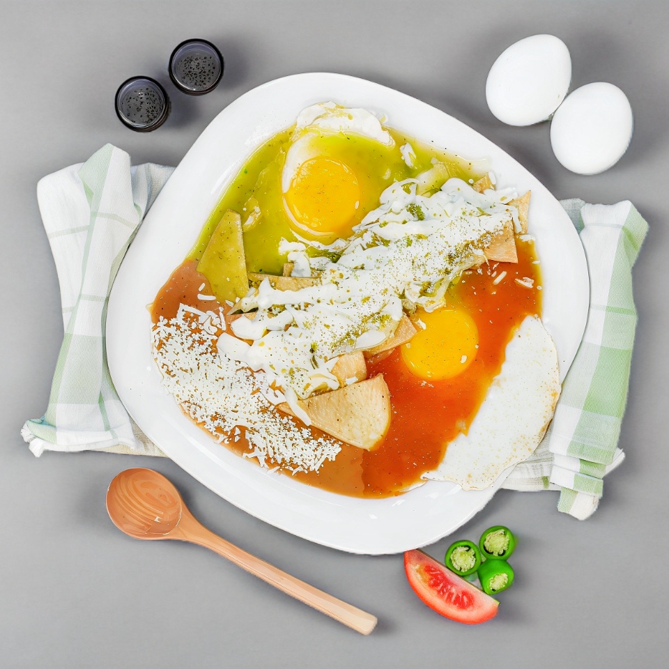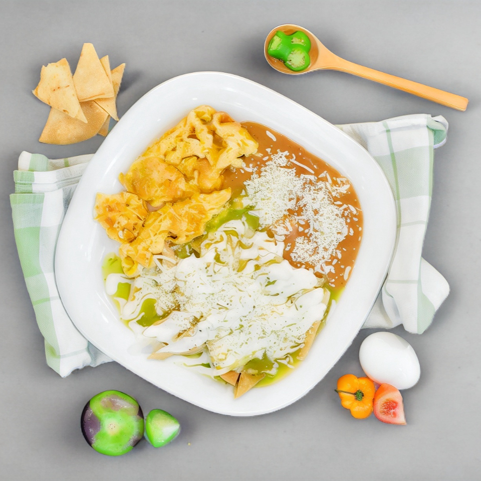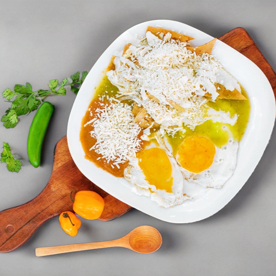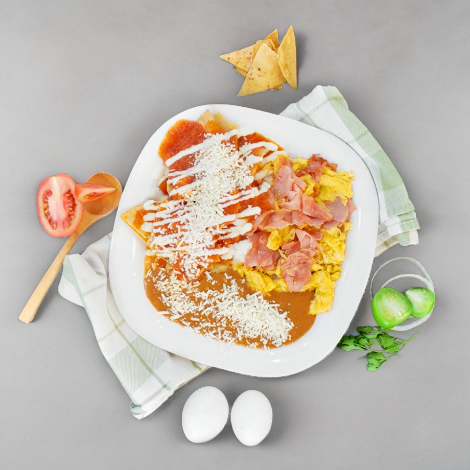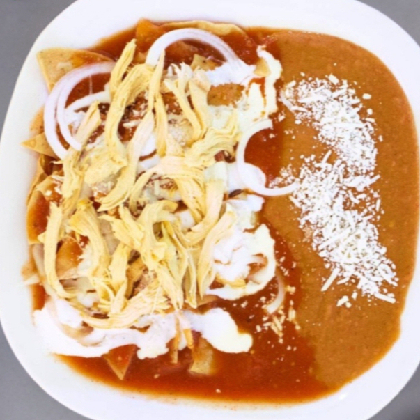 Totopos fritos bañados en salsa roja o verde a tu elección con queso, crema y cebolla acompañados de pechuga de pollo desmenuzada incluye frijoles refritos con queso.