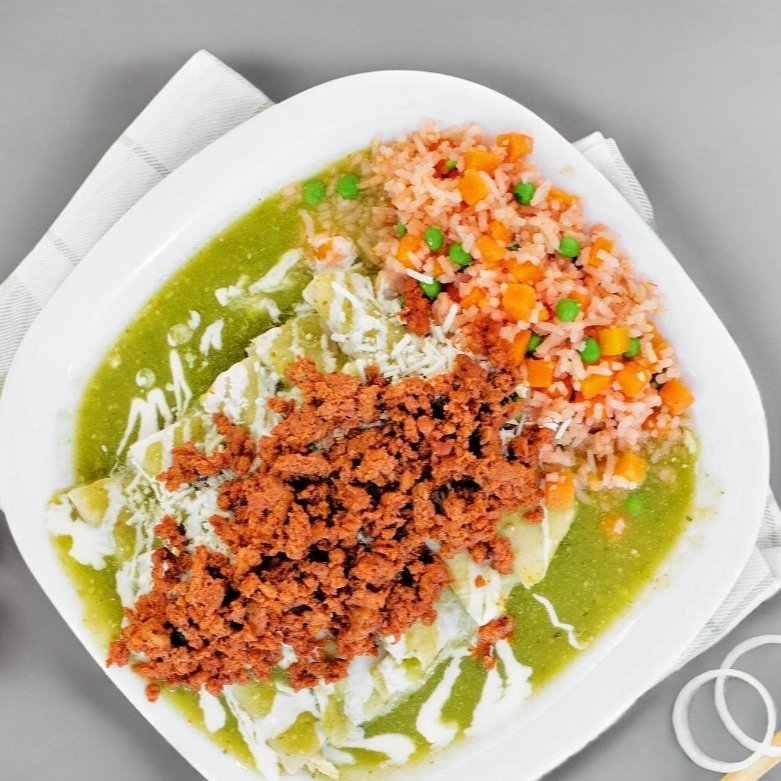 5 Deliciosas enchiladas verdes con tortilla frita, rellenas de pollo o queso a tu elección, bañadas en salsa verde con queso, crema y cebolla acompañadas de chorizo frito incluye arroz rojo con verduras.