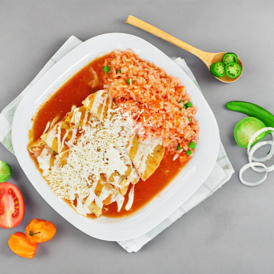5 Deliciosas enjitomatadas con tortilla frita, rellenas de pollo o queso a tu elección, bañadas en salsa de jitomate sin picante con queso, crema y cebolla incluye arroz rojo con verduras.