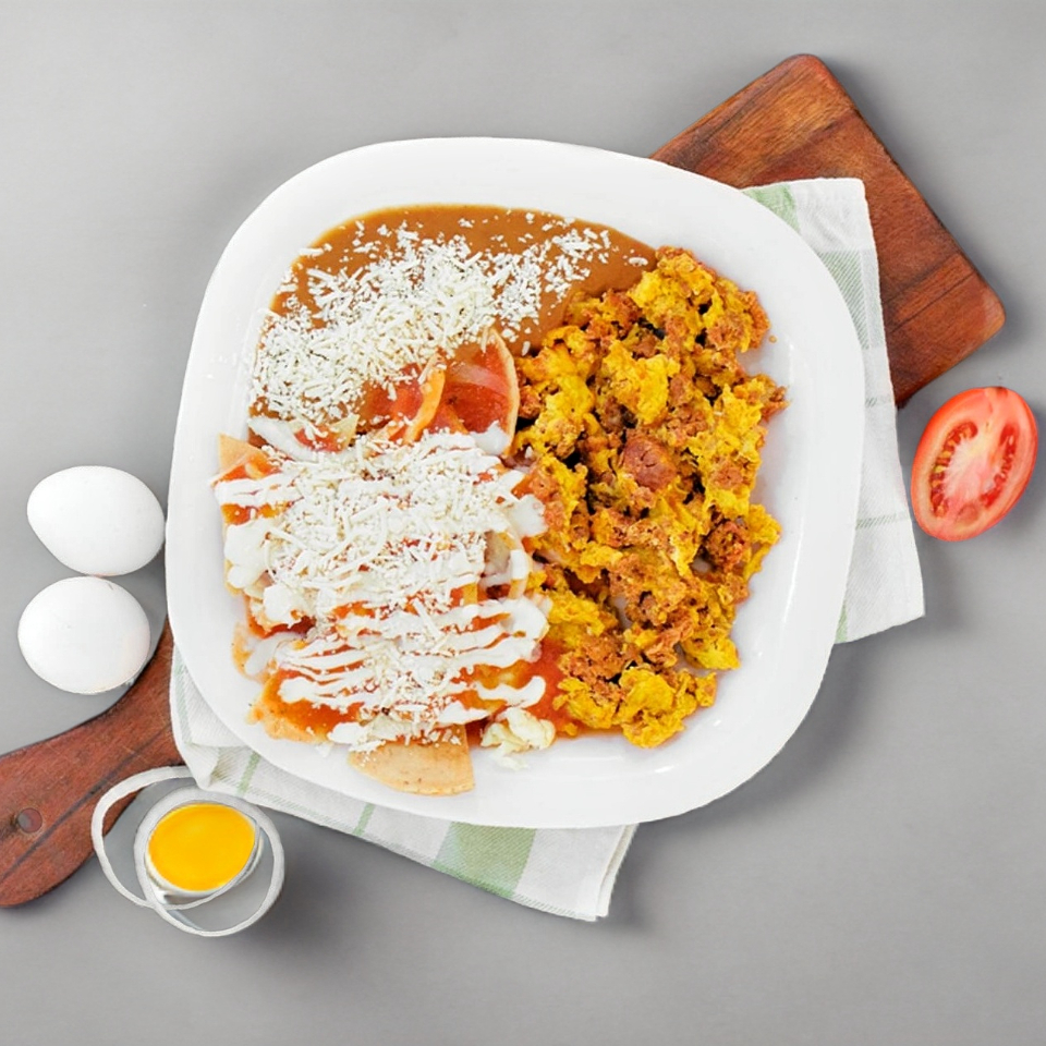 Totopos fritos bañados en salsa a tu elección, decorados con queso, crema y cebolla. Con Arrachera, acompañados de refritos.