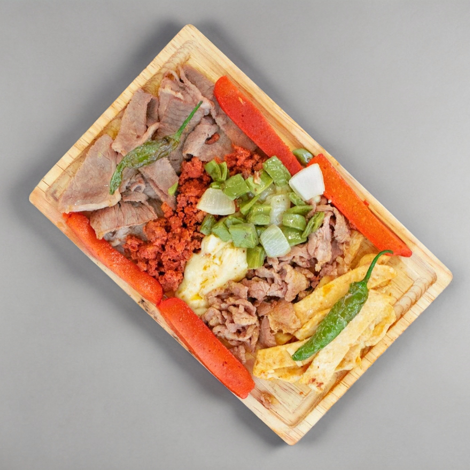 Bistec de res, bistec de pollo, chorizo, salchicha asada, queso fundido y nopales fritos con cebolla, acompañados de salsas, frijoles refritos con queso y tortillas.