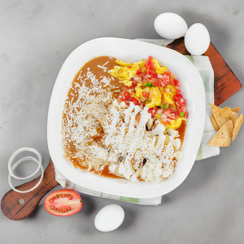 Totopos fritos bañados en salsa rojos con cebolla y acompañados de frijoles refritos con queso y crema.