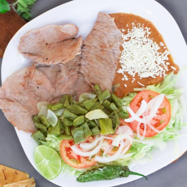 Bistec especial de res asado cortado en tiras, incluye ensalada de jitomate, lechuga y cebolla, nopales asados con cebolla y frijoles refritos con queso, salsa martajada y tortillas.