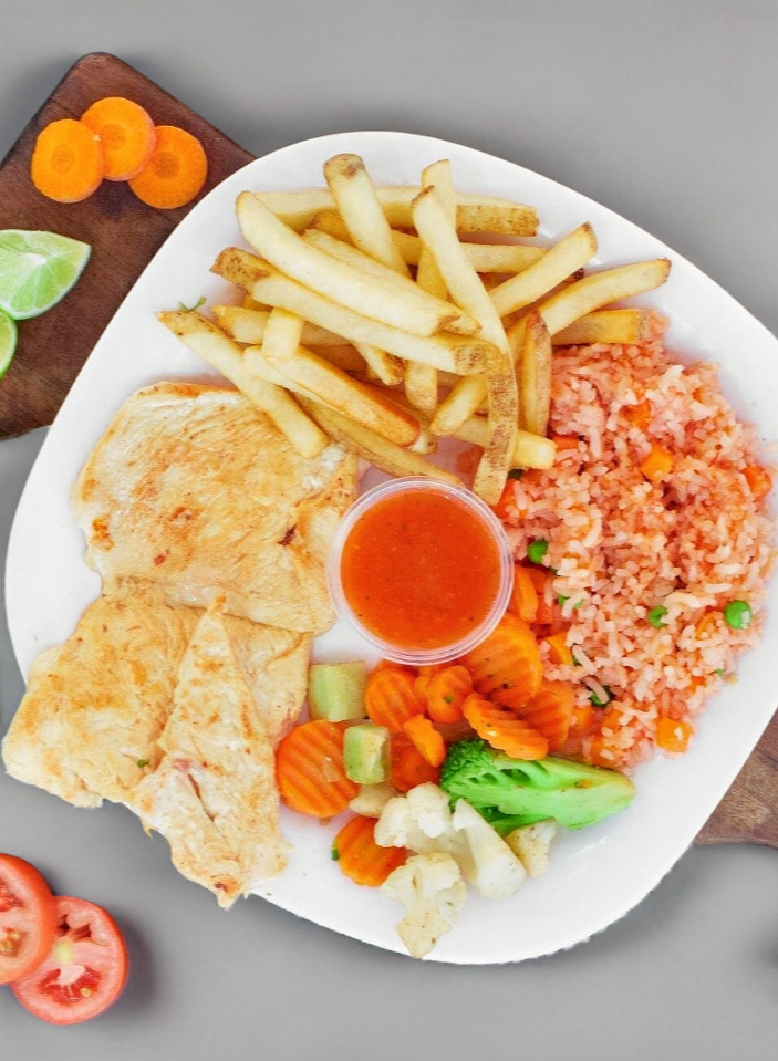 Bistec de pollo a la plancha, acompañado de arroz con verduras, papas a la francesa, verduras salteadas a la mantequilla, salsa de jitomate y tortillas.