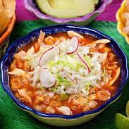 Un litro de pozole rojo, con deshebrada de puerco, cabeza, lechuga, rabanos y tostadas