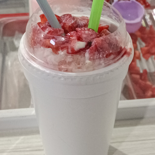 Delicioso y refrescante raspado artesanal a base de fresa natural, concentrados de leche y jarabes elaborados por la casa