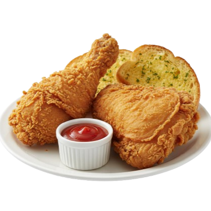 Orden personal de pollo frito apanado 2 piezas: pierna y muslo acompañado con ketchup dos (2) rebanadas de pan tostado con mantequilla de ajo.