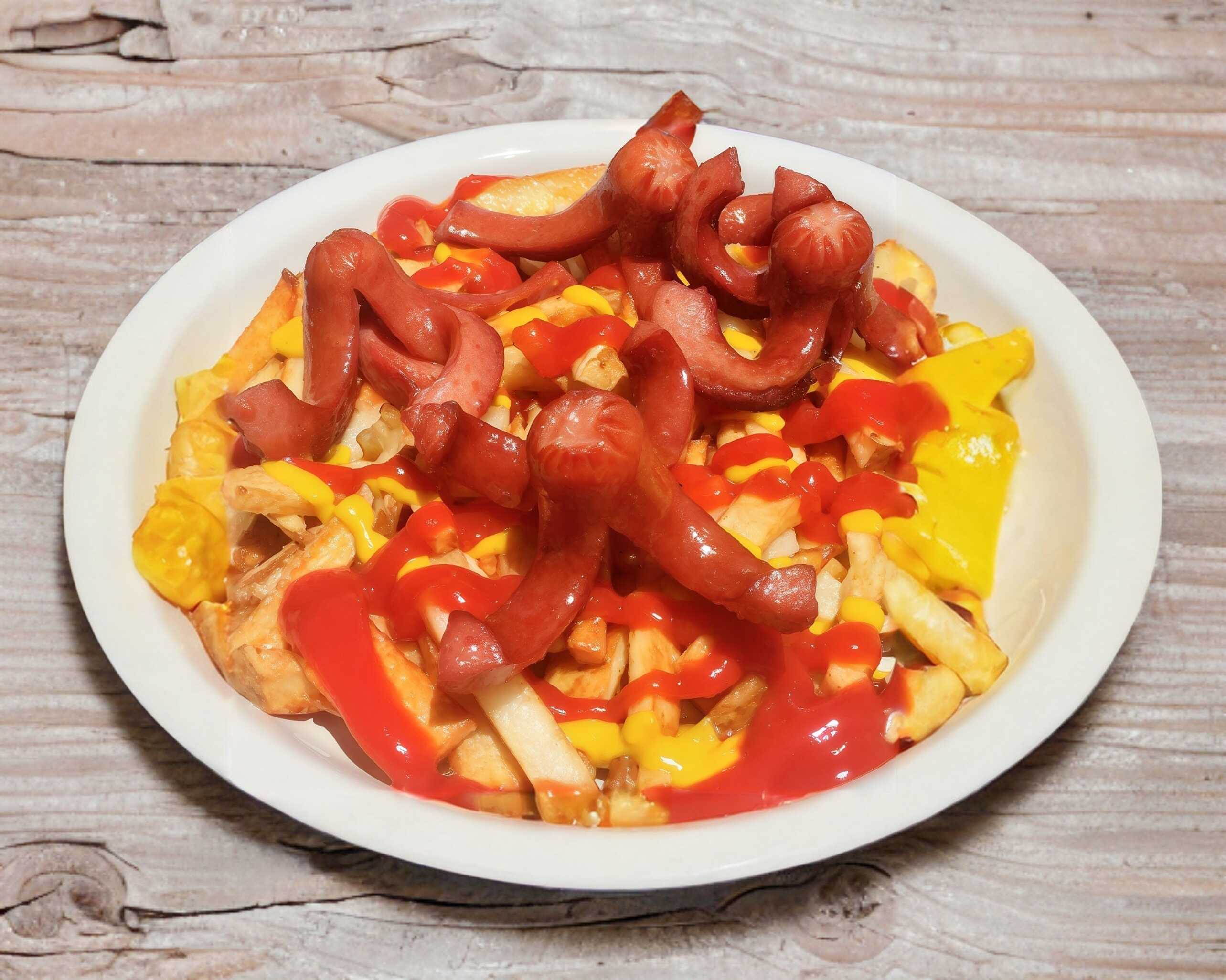 Trocitos de salchicha con papas a la francesa.