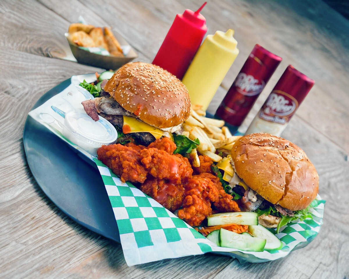 Box con: 2 hamburguesas, alitas, papas, ranch y 2 refrescos