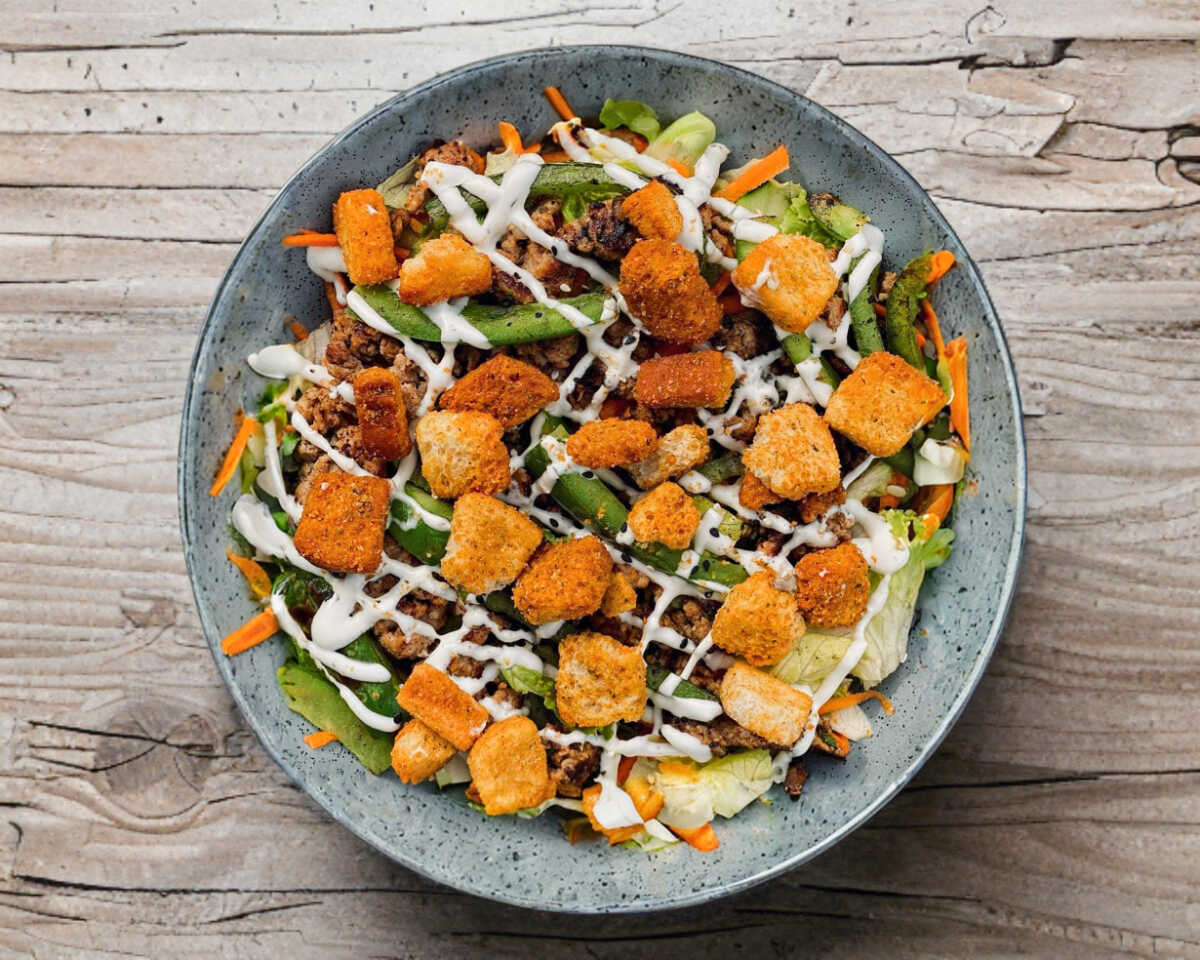 Carne, pimientos asados, lechuga, jitomate, zanahoria, aderezo ranch, crotones y mezcla de ajonjolí.