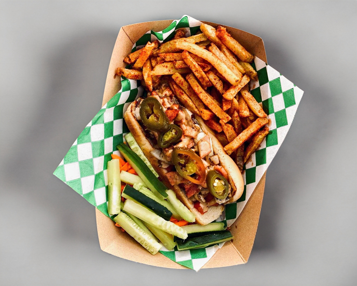 Salchicha de pavo, queso para nachos, tocineta, cebolla asada, jitomate, aderezo de la casa y porción de papas a la francesa.