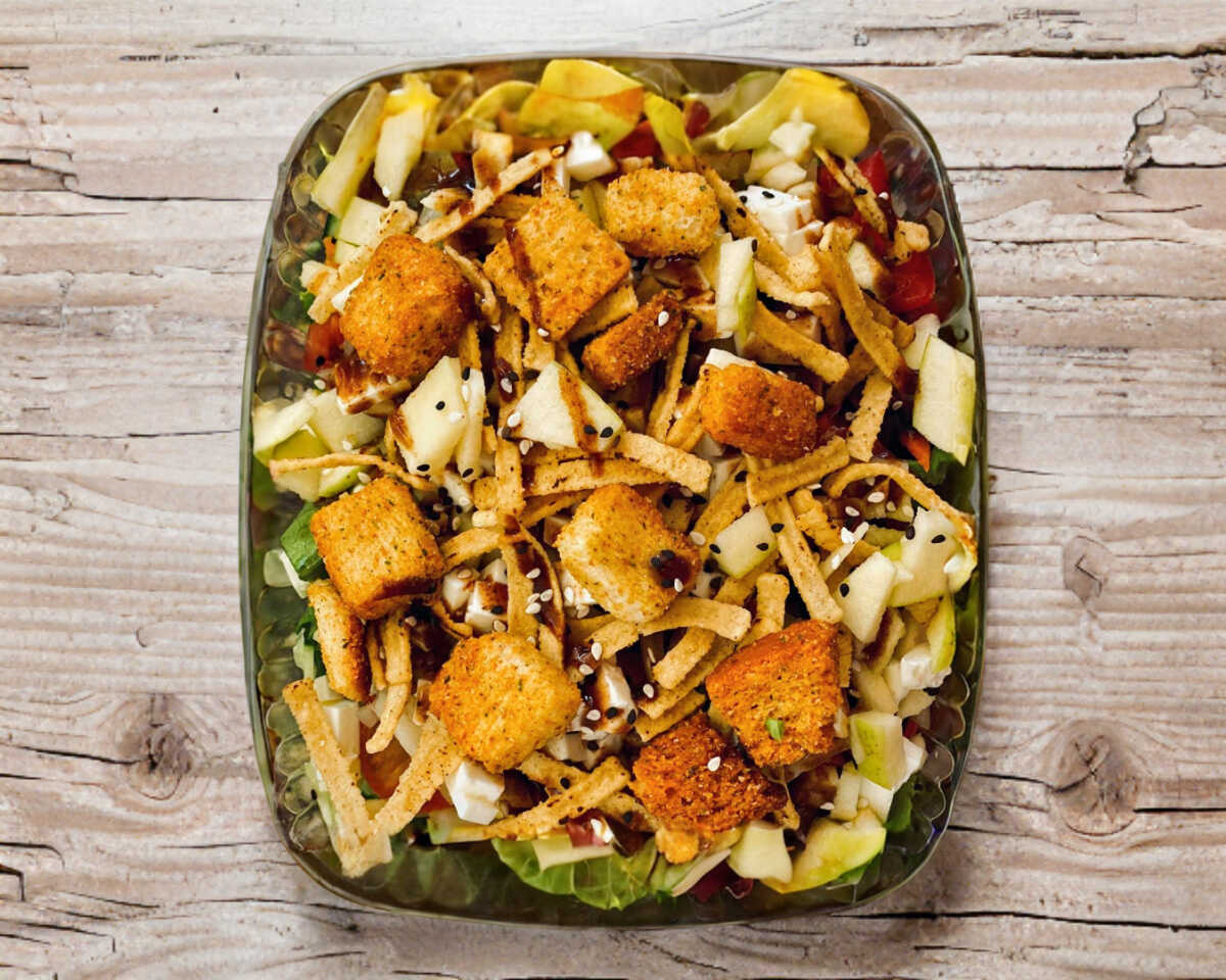 Pechuga de pollo a la plancha, queso panela, manzana, lechuga, pepino, jitomate, zanahoria, aderezo ranch, tiritas de maíz, crotones y mezcla de ajonjolí.