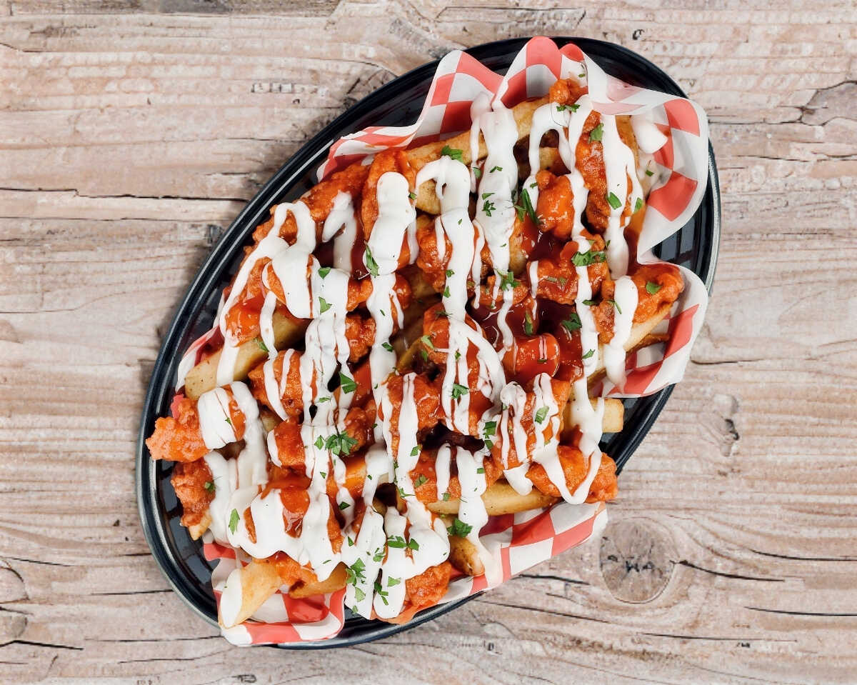 Papas a la francesa con pequeños pedazos de pechuga de pollo empanizados, bañados en la salsa de tu elección y aderezo ranch