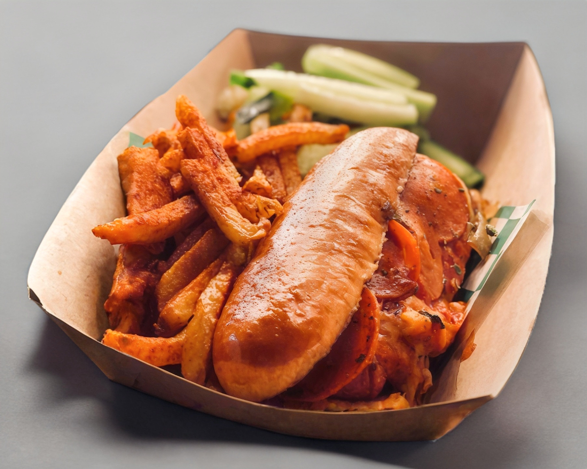 Salchicha de pavo, chorizo, cebolla asada, jitomate, aderezo de la casa y porción de papas a la francesa.
