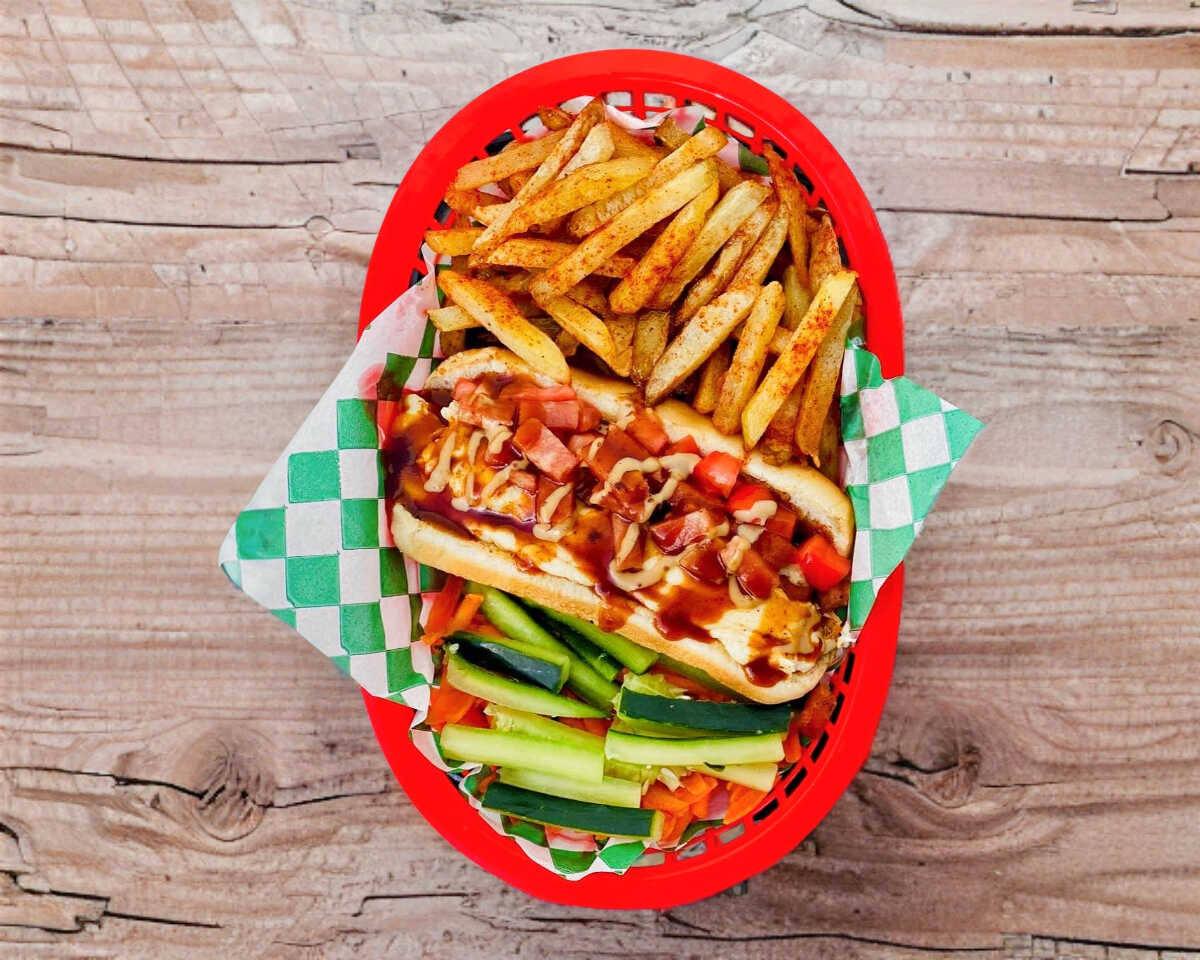 Salchicha de pavo, piña asada, queso asadero, cebolla asada, jitomate, aderezo de la casa y porción de papas a la francesa.