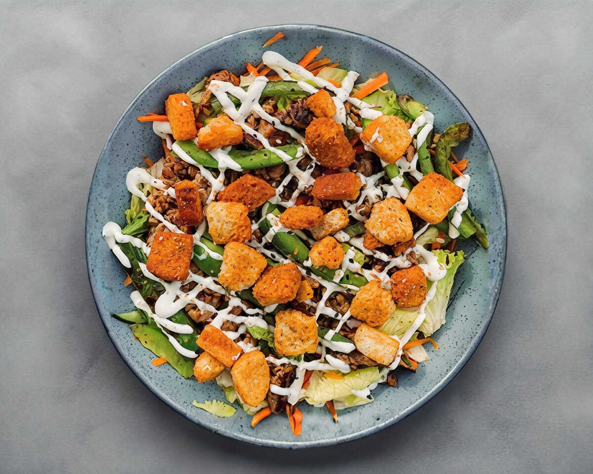 Pechuga de pollo a la plancha, lechuga, pepino, jitomate, zanahoria, aderezo ranch, crotones y mezcla de ajonjolí.