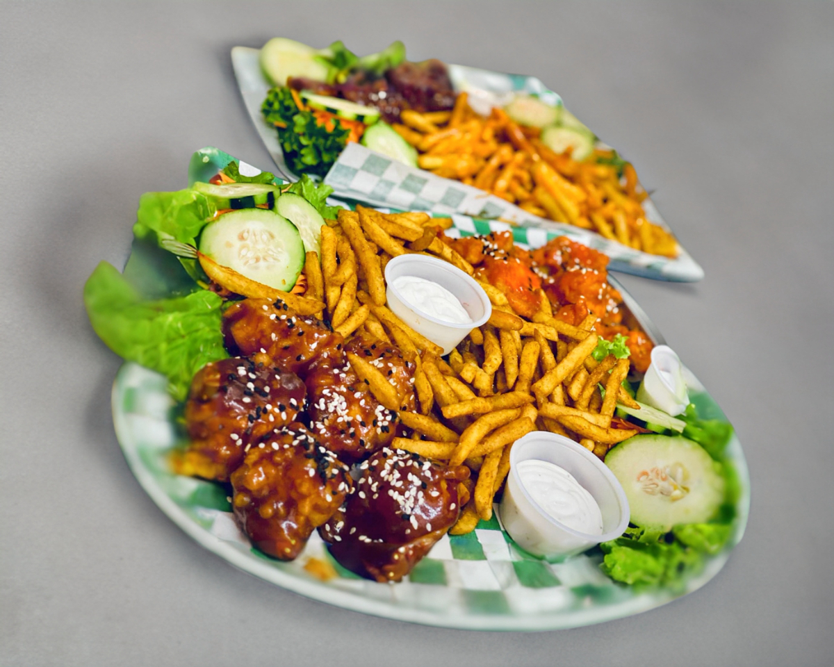 Boneless de pechuga de pollo, bañadas en la salsa de tu elección, porción de papas, vegetales y aderezo ranch.