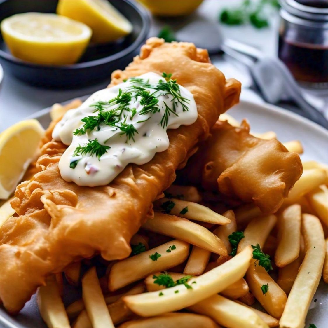 Crujientes filetes de pescado empanizados y papas fritas. Acompañado con salsa tártara y limón.