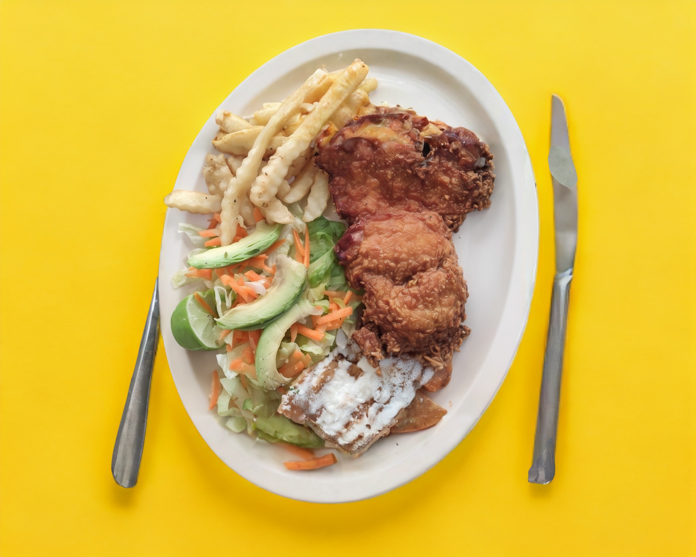 Pieza de milanesa de pollo ó cerdo acompañado de ensalada de lechuga, chilaquiles, papas a la francesa, frijoles refritos, salsa de la abuela