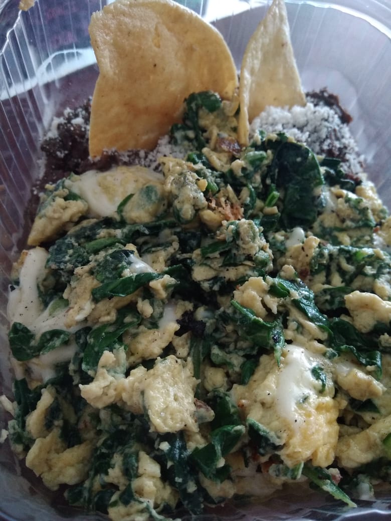 Huevos revueltos con espinacas , acompañados con frijoles refritos y salsa de la abuela