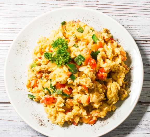 Huevos revueltos con jitomate, cebolla y chile serrano, acompañados d frijoles r