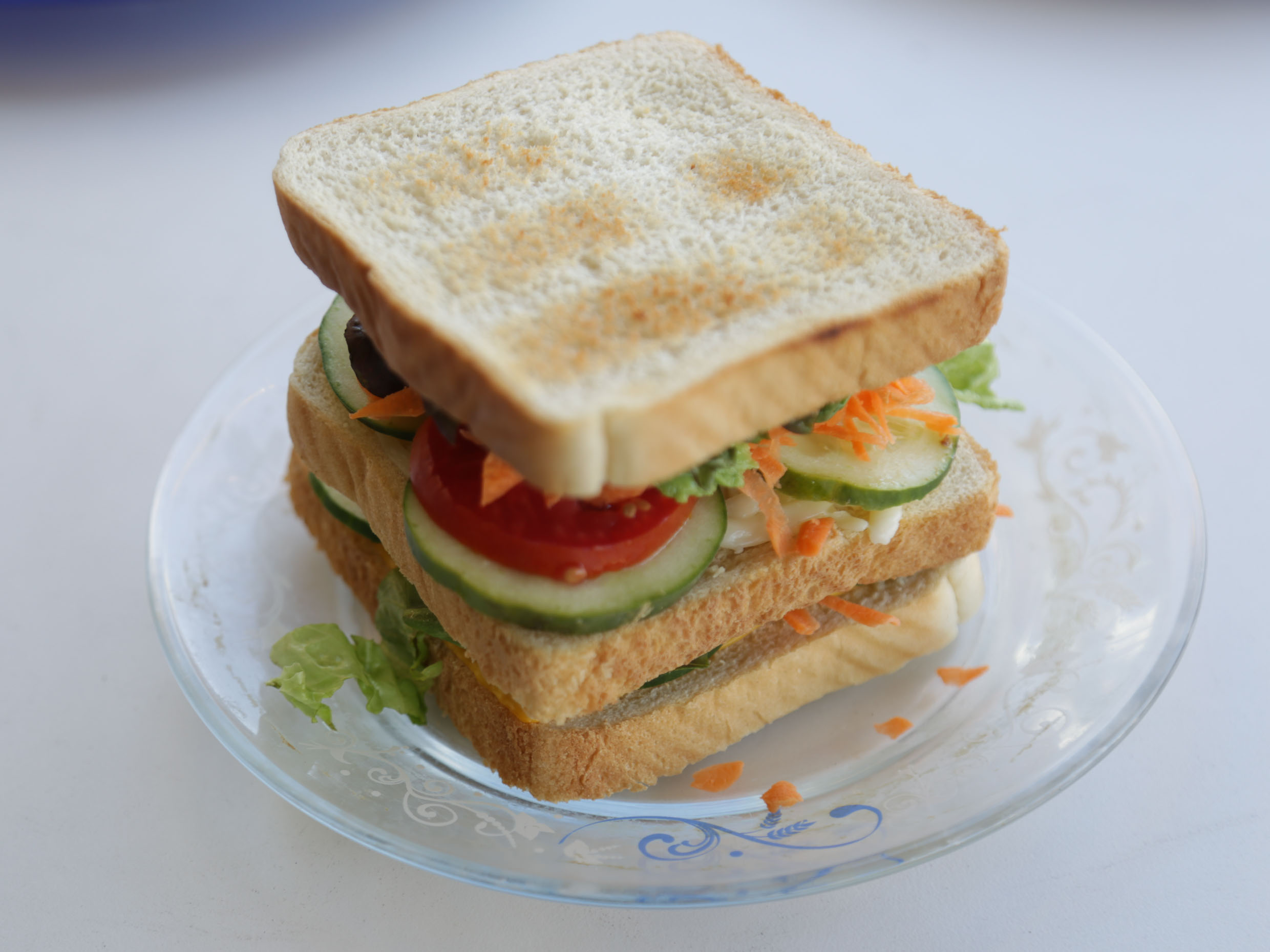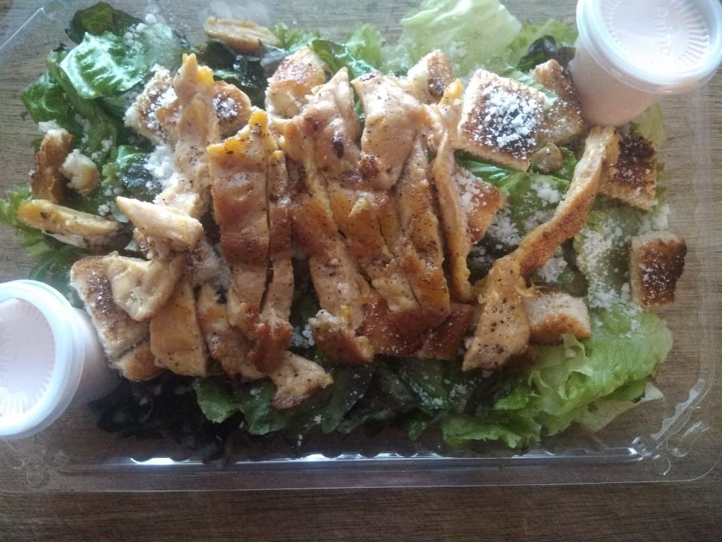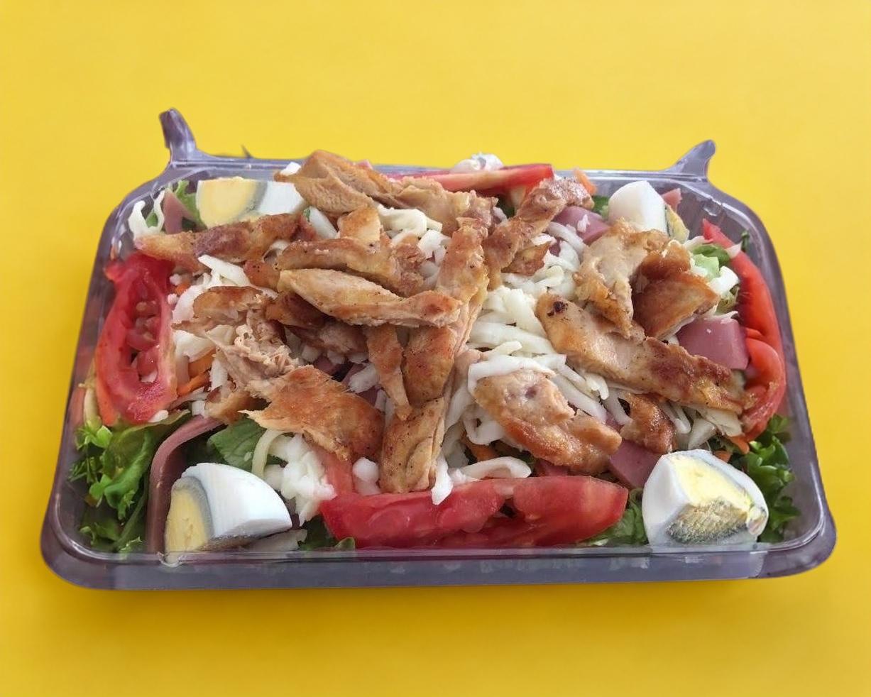 Lechuga sangría, zanahoria rayada, jitomate, huevo cocido, jamón de pavo, pollo a la plancha, queso asadero, aderezo del chef