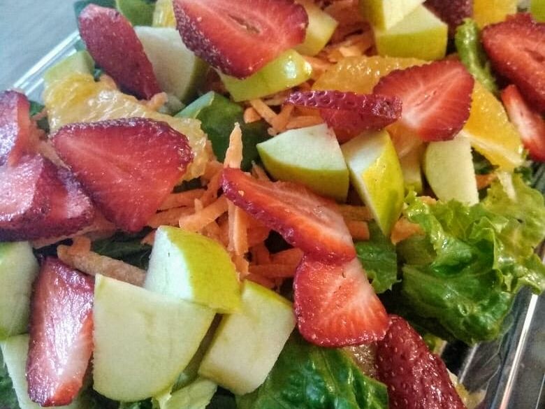 Lechuga sangría, zanahoria rayada, gajos de naranja, manzana verde en rodajas, fresa, pepita verde y aderezo del chef