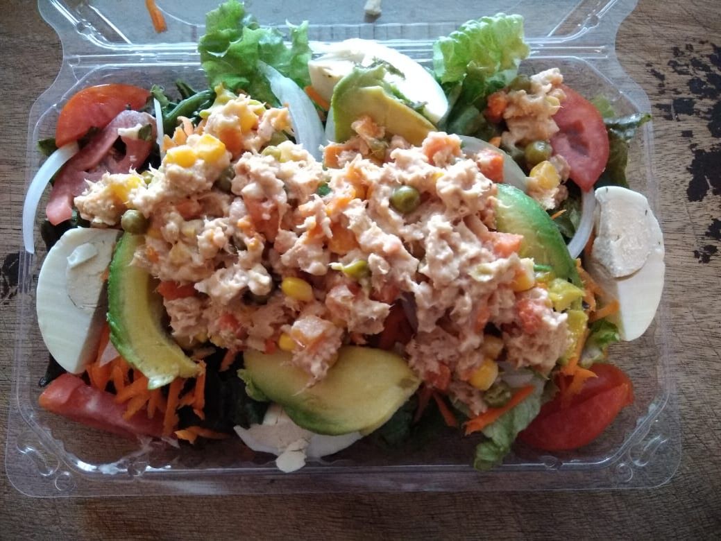Lechuga sangría, zanahoria rayada, jitomate, huevo cocido, atún desmenuzado, ajonjolí, aguacate, aderezo del chef