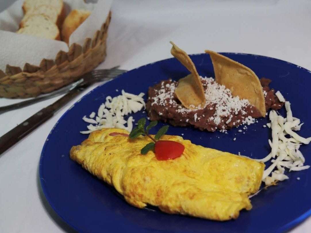 Huevo en torta y enrollado, relleno de jamón y queso, acompañado de frijoles refritos y salsa de la abuela