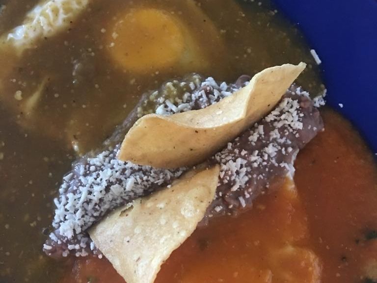 2 huevos estrellados sobre cama de tortilla frita, bañados de salsa verde y roja, acompañados de frijoles refritos