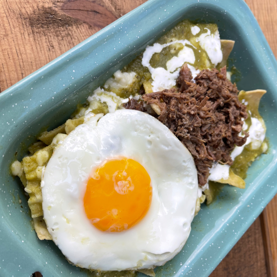 Deliciosos chilaquiles bañados en la salsa de tu elección, acompañados de queso, crema y nuestra deliciosa birria. Puedes agregar huevo a tu gusto.
