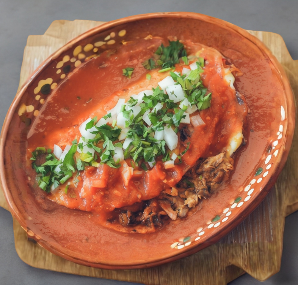 Burrito relleno de frijoles charros y birria, cubierto con una costra de queso y ahogado en nuestra salsa morita o chipotle.
