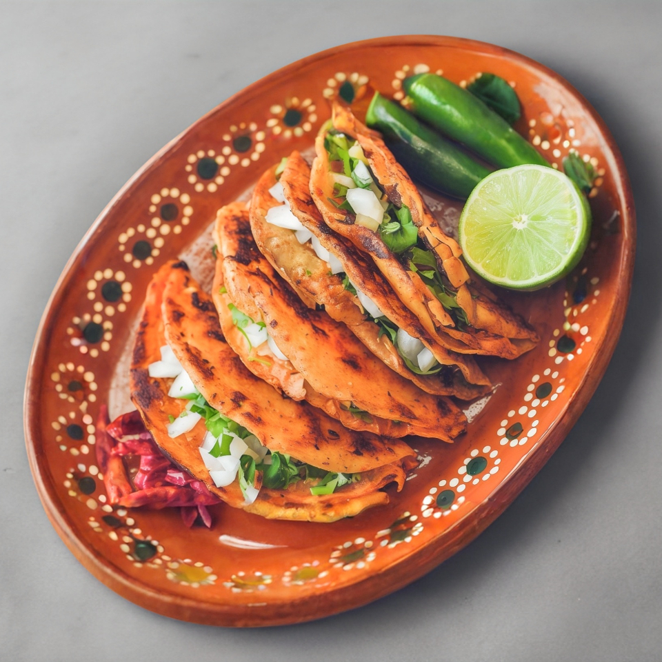 Quesadilla de birria con tortilla de harina, cebolla, cilantro, chile serrano y salsa a elegir.