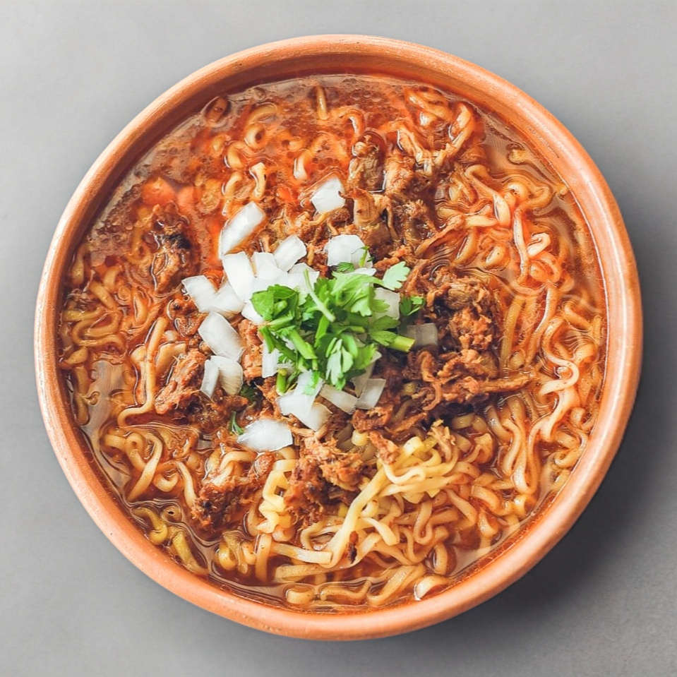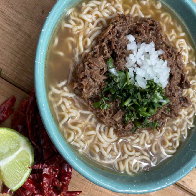 No puedes terminar tu orden sin probar esta delicia! Ramen cocido y servido en nuestro consomé y birria