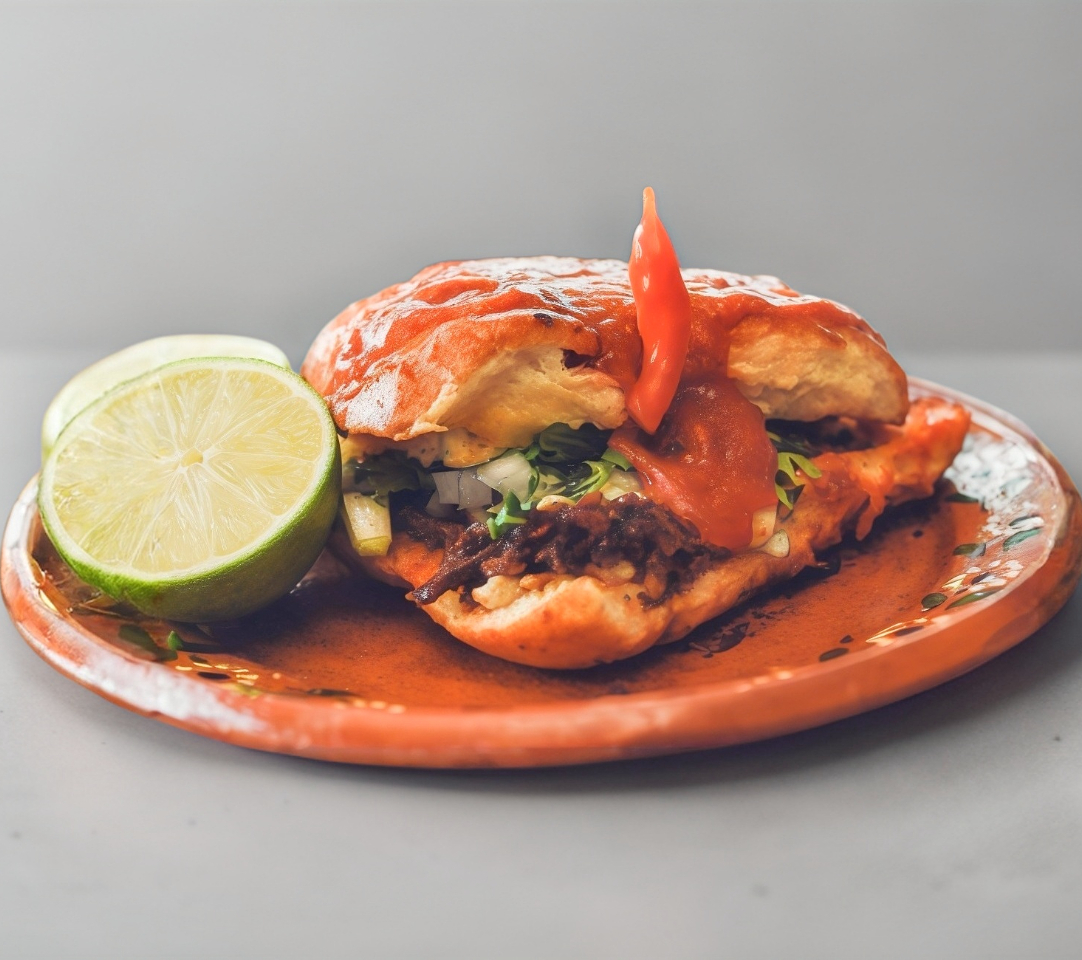 Torta de birria ahogada en nuestra salsa morita o chipotle.