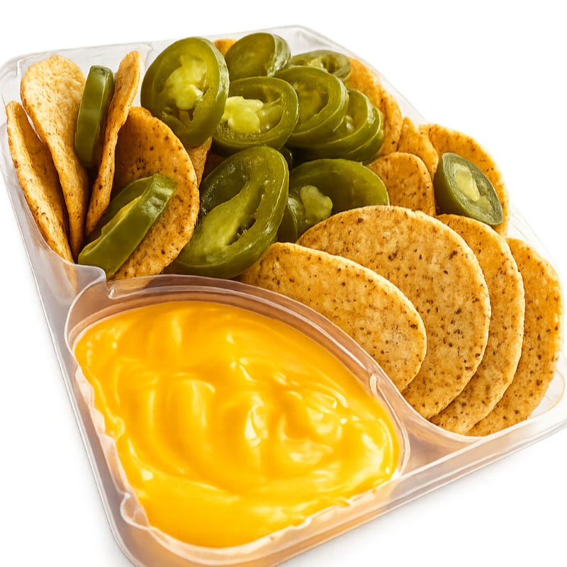crujientes nachos bañados en queso amarillo, con chiles en vinagre.