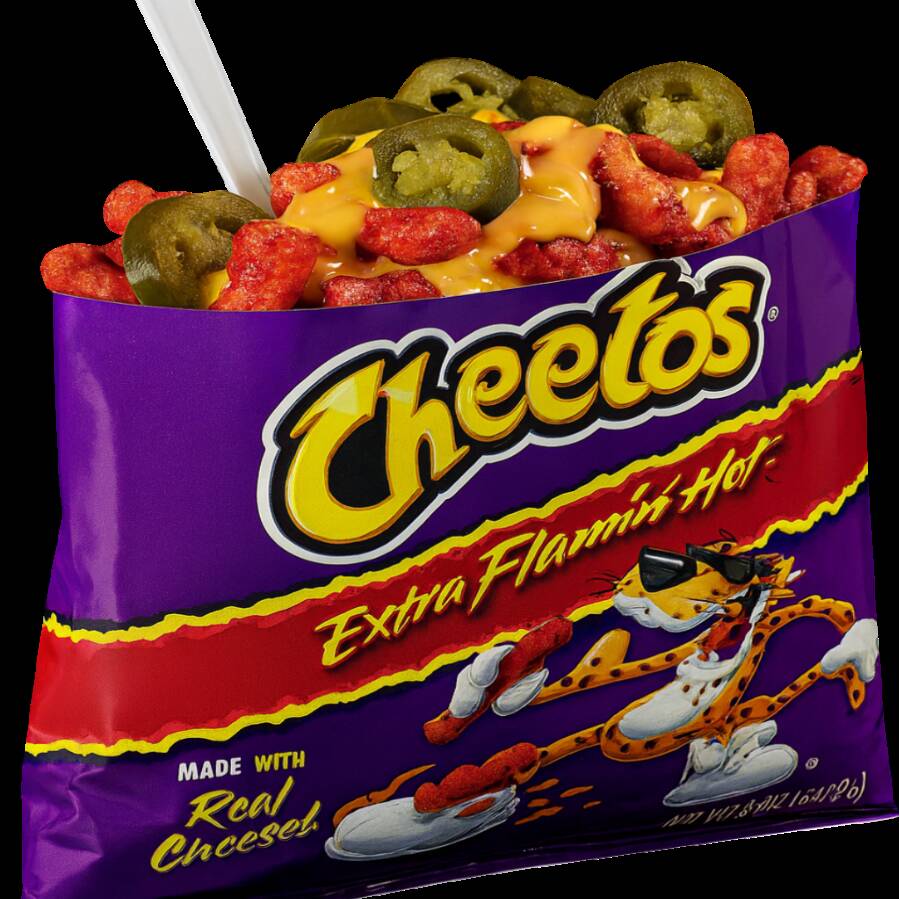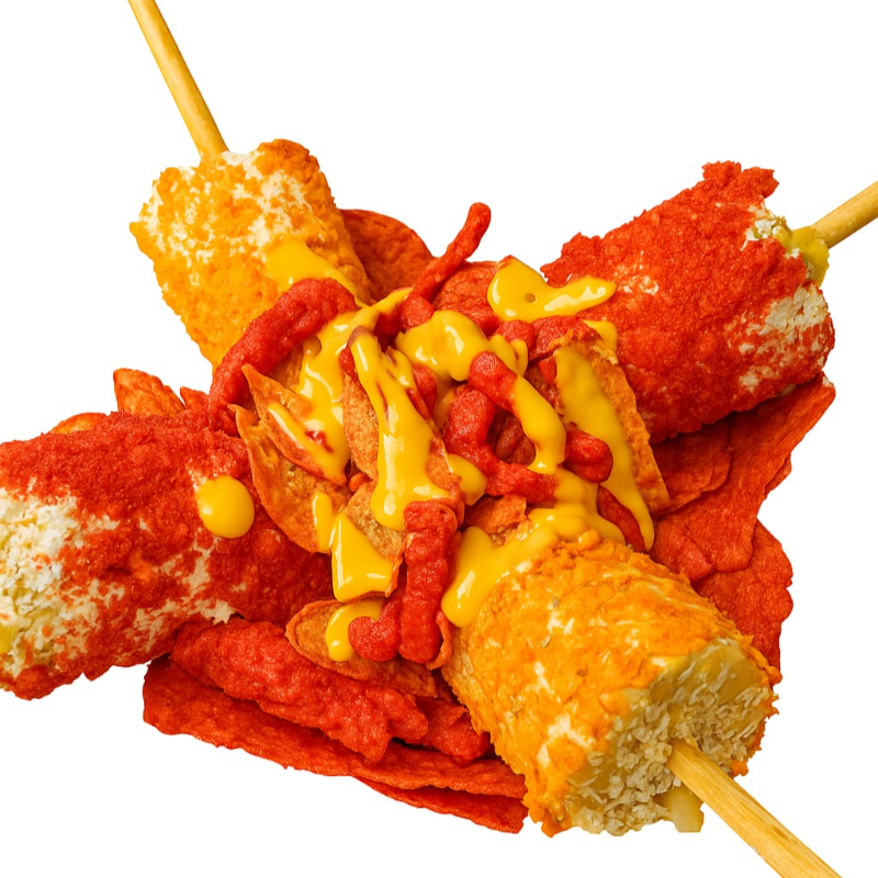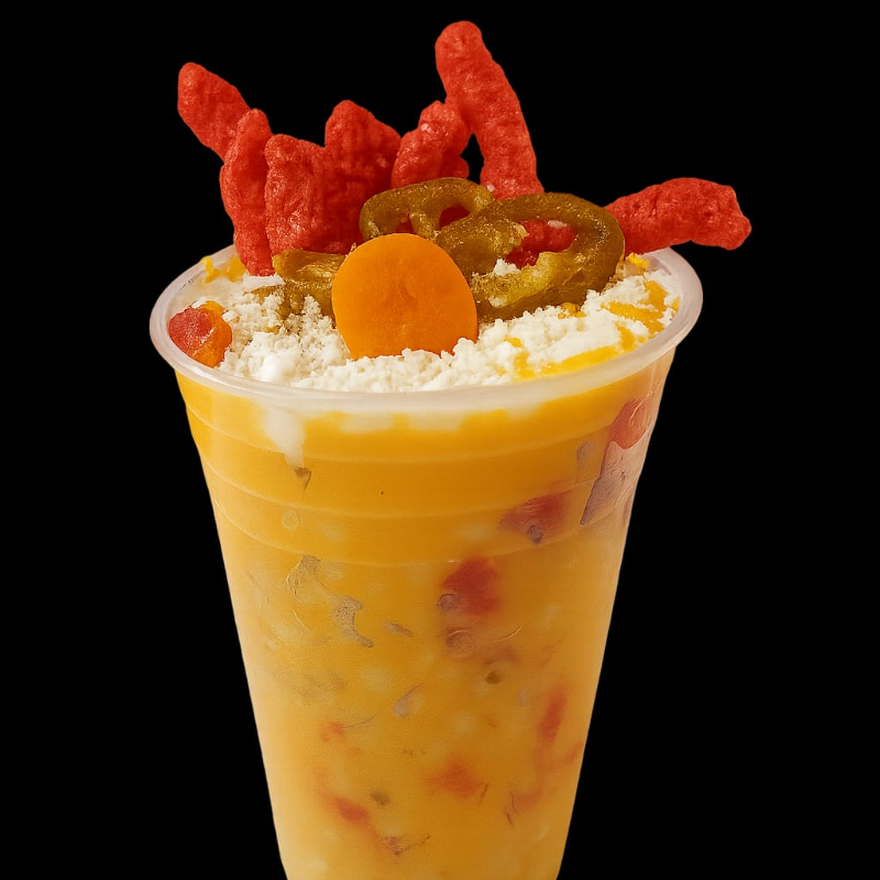 Grano de elote cocido, bañado en queso amarillo, Aderezo de la casa, queso sierra, Cheetos Flamin Hot y chiles en vinagre.