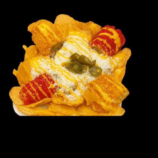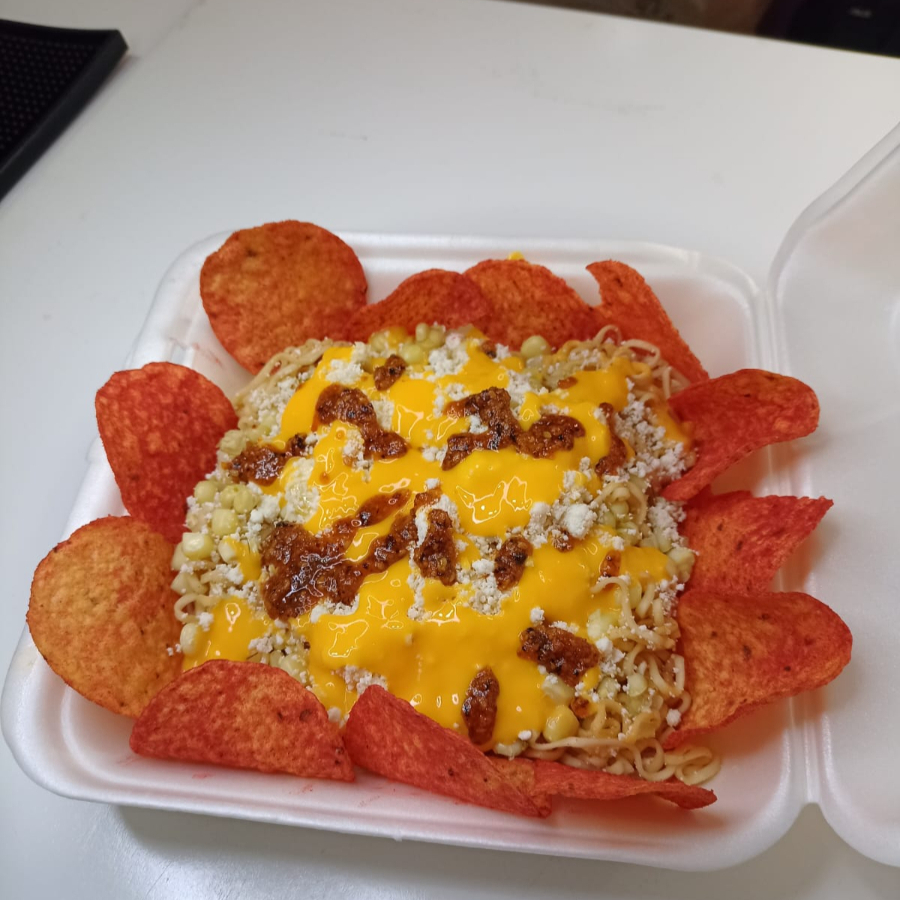 Maruchan con grano de elote cocido, queso amarillo, queso sierra y papas de tu elección.