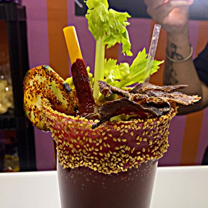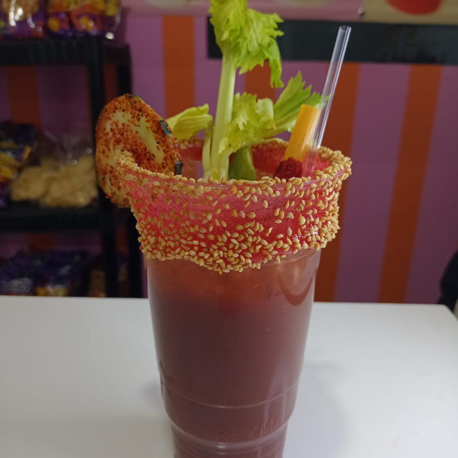 Clamato preparado de la casa, con salsas negras, escarchado en pulpa de sandia y ajonjoli garapiñado, banderilla de tamarindo, pepino enchilado y baston de apio.