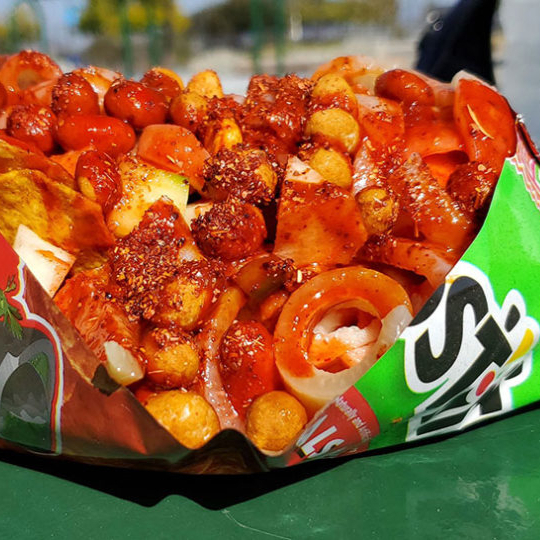Papas naturales, bañadas en salsas negras de la casa, tajin, cacahuates, trozitos de tamarindo, pepino.