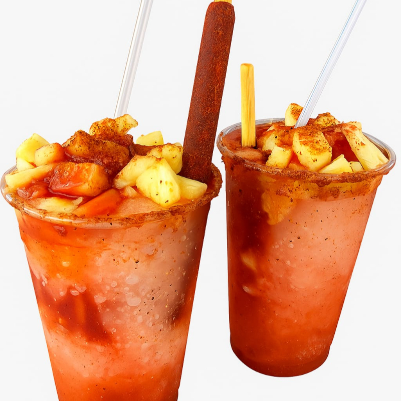 Refrescante bebida a base de hielo escarchado con limon, chamoy, chile tajin, banderilla de tamarindo y fruta de tu preferencia.