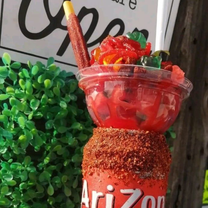 Arizona de Sandia, escarchado con tajin picosito y una base de gomitas locas preparadas y una banderilla de tamarindo.