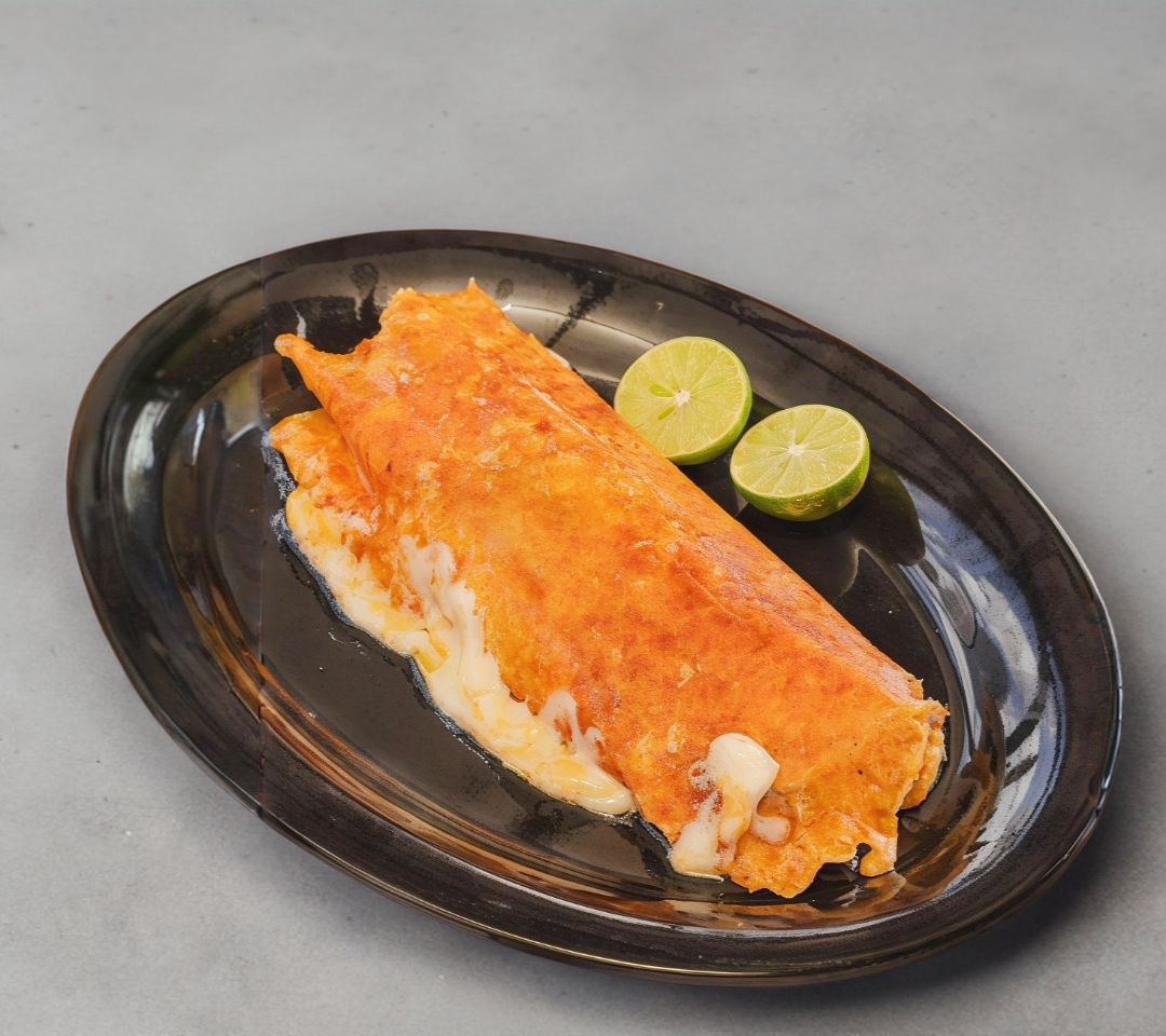 Exquisita costra de queso rellena de birria, bañada de nuestra deliciosa salsa, acompañado de cebolla, cilantro y salsa picante. Incluye un consomé.