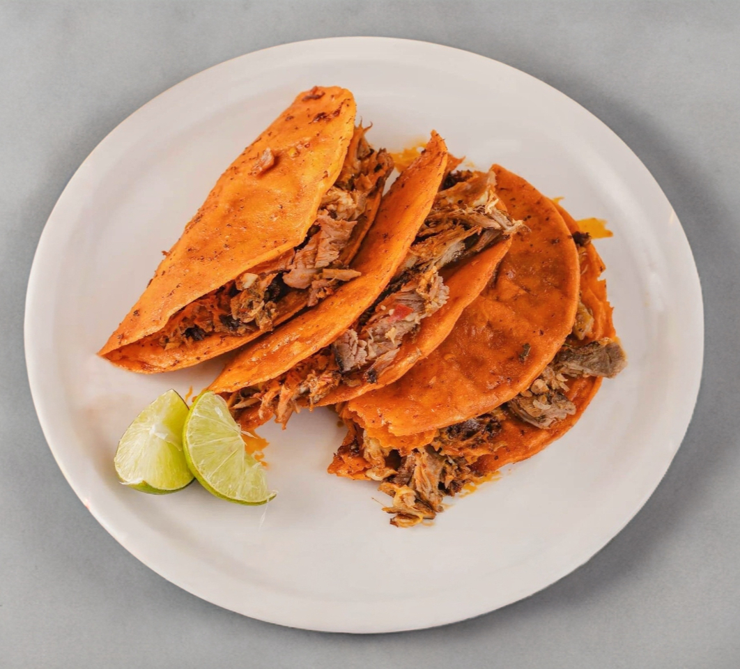 Taco previamente dorando con nuestra deliciosa salsa, relleno de birria, acompañado de cebolla, cilantro y salsa picante.