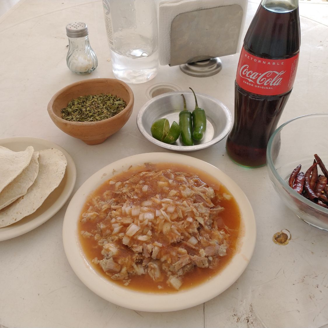 Plato con 130g de Birria de Borrego, tortillas, consomé y refresco