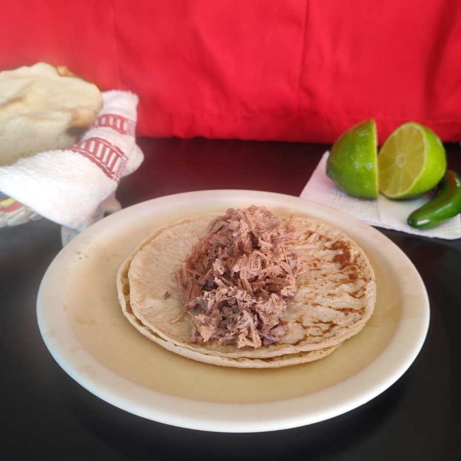 Delicioso taco de birria servido en tortilla de maíz con la carne de tu elección.