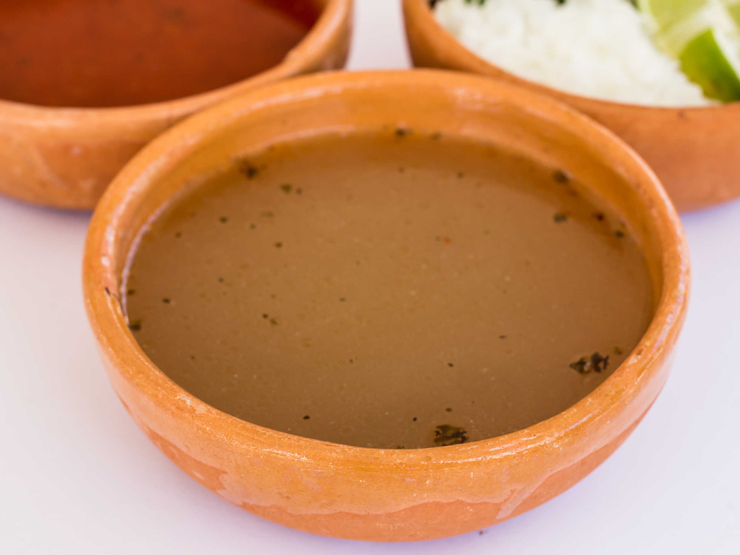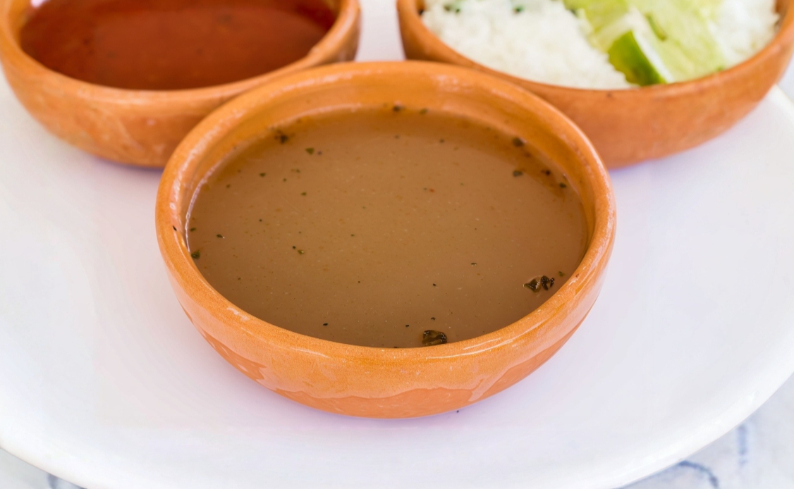 Delicioso consomé con garbanzo y arroz, acompañado de cebolla y limón por aparte.